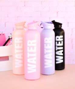 Botella recta de plástico en colores pastel con palabra WATER estampada en serigrafía blanca